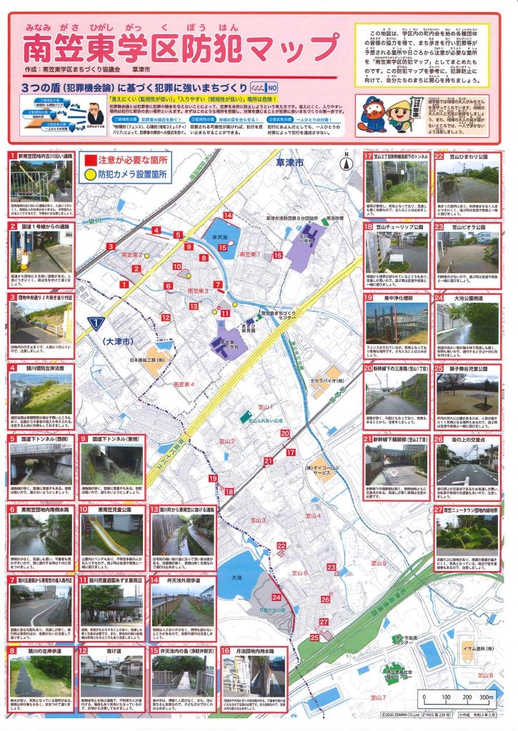 南笠東学区まちづくり協議会では、草津市危機管理課と共同で、昨年より学区防犯マップ作製に向けて取り組んでまいりました。昨年9月21日(土)には町内会別に分かれ、注意個所調査のため「まち歩き」を行いました。その後、たたき台の取りまとめ、注意個所と現地写真の確認、原稿(案)作成、草津市との打ち合わせなどを行い、2月20日に南笠東学区防犯マップが完成し、草津市より送付を受けました。3月1日付けで、各町内会を通じて全戸配布、また関係機関にも送付しました。この防犯マップを参考に、犯罪防止に向けて日ごろから関心をお持ちくださるようお願いします。