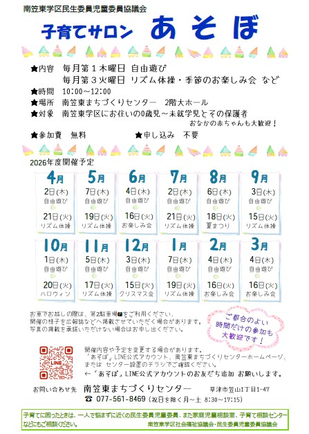 南笠東学区民生委員児童協議会では、子育てサロン「あそぼ」を開催しております。令和8年度の年間計画をお知らせいたします。詳細については、主催者発行のチラシをご覧ください。場所:南笠東まちづくりセンター