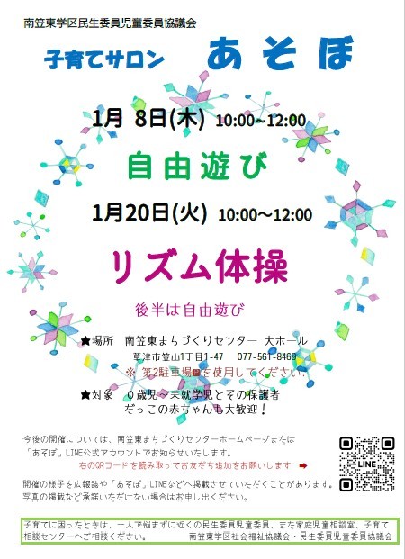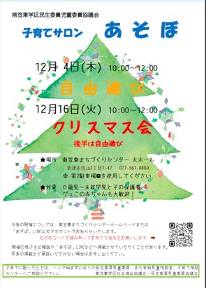 南笠東学区民生委員児童協議会では、子育てサロン「あそぼ」を開催されます。詳細については、主催者発行のチラシをご覧ください。