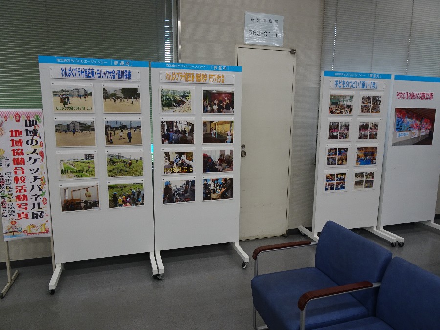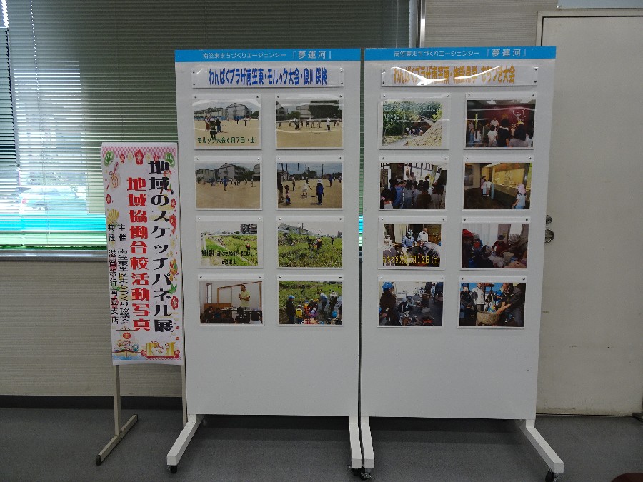南笠東学区の活動を紹介する「地域のパネル展」を、滋賀銀行南笠支店ロビーをお借りして開催しています。今回は、地域協働合校の様子を写真にして展示していますのでご覧になってください。