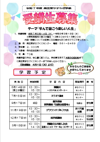 南笠東まちづくりセンターでは、60歳以上の皆さんの知識と教育を深める場として、やすらぎ学級を開催してい ます。令和7年度の受講生の募集を4月1日から行いますので、受講ください。