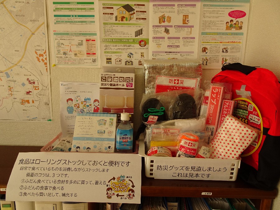 9月1日は防災の日でした。 防災マップや防災リュックやハザードマップを展示しております。