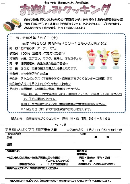 今年度最後のわんぱくプラザは、クッキングをします。南笠東学区在住の児童は申し込みできます。詳しくはチラシをご覧ください。